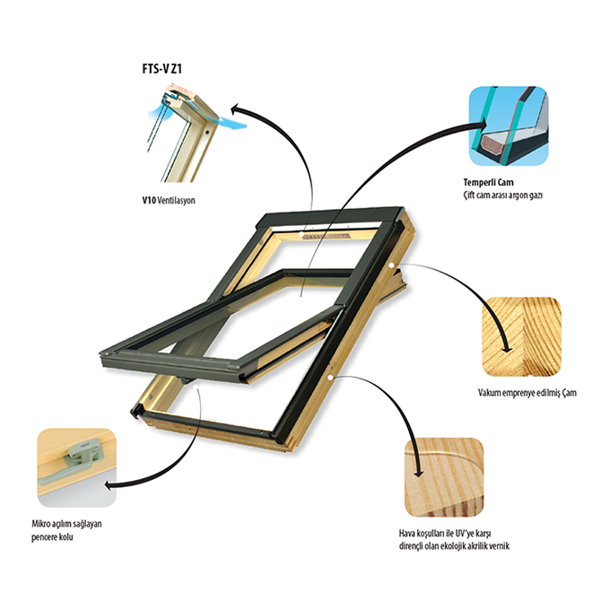 Standart Fakro Çatı Penceresine ;Ahşap görünümlü pencereler ahşap üzeri ekolojik vernikle kaplanmaktadır. Bu sayede ahşabın sıcaklığının daha iyi vurgulandığı mekanlarda ahşaba kazandırılan direnç uzun yıllar kullanımınıza olanak sağlamaktadır. 180 derece dönebilen pencere kanadı ve sabitleme mandalı ile kullanabileceğiniz fakro standart çatı pencereleri pencere kanatlarının kolaylıkla ve güvenli şekilde temizlenmesine de olanak sağlamaktadır.