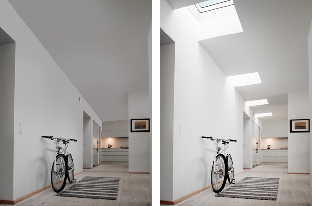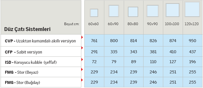 Velux Düz Teras Çatı Penceresi ; Düşük eğimli çatılarda pencere uygulaması, Her mekanda gün ışığı. Teras çatıya sahip birçok evde, ofiste, okul ya da hastanede düşey pencerelerden uzakta, bina çekirdeğine yakın, iç bölümlerde kalan alanlar çoğunlukla gün ışığından oldukça az faydalanabilirler. Yeni teras çatı sistemleri ile bu alanlara ihtiyaç duyulan gün ışığı ve temiz havayı estetik bir tasarımla sunmaktayız. Teras çatı sistemleri, 0-15 derece arası düz veya düşük eğimli çatı ve teraslarda kullanılmaktadır. Sistem iki modelden oluşmaktadır: uzaktan kumanda ile açılıp kapanabilen akıllı versiyon CVP ile sadece doğal aydınlık almanın yeterli olduğu mekanlar için sabit versiyon CFP.